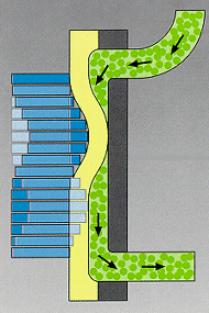 het materiaal konstant naar buiten gedrukt waardoor het